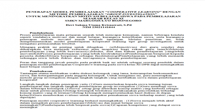 PENERAPAN MODEL PEMBELAJARAN “COOPERATIVE LEARNING” DENGAN METODE PEMBELAJARAN “GROUP INVESTIGATION” UNTUK MENINGKATKAN MOTIVASI BELAJAR SISWA PADA PEMBELAJARAN SEJARAH KELAS XI SMKN MARGOMULYO BOJONEGORO